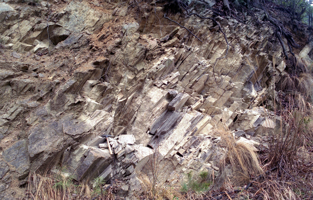 兵庫県丹波市に分布する流紋岩質で結晶の多い溶結凝灰岩の露頭写真です。顕著な板状節理が見られ、「丹波鉄平石」と呼ばれる石材にも利用されています。[画像クリックで拡大]