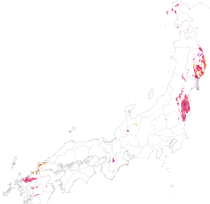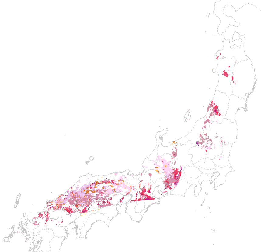 後期白亜紀の火成岩類の分布。塗りつぶされた地域が分布域です。広い範囲にわたって分布しており、特に西南日本のかなりの地域を占めていることが分かります。[画像クリックで拡大]