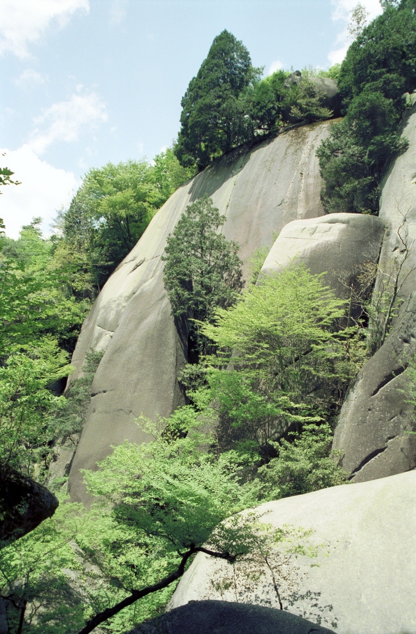 岐阜県鬼岩公園に見られる一枚岩の花崗岩 (太郎岩)。一帯には花崗岩特有の風化地形が見られます。1991年5月撮影。[画像クリックで拡大]