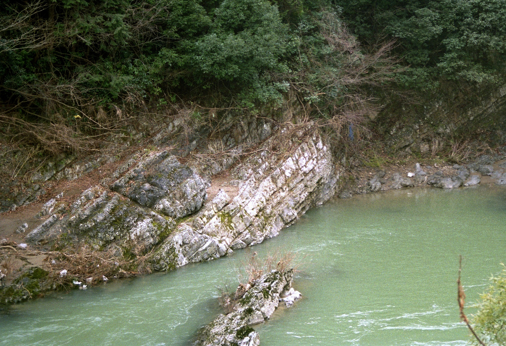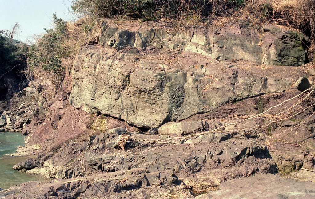 兵庫県丹波市篠山川に見られる篠山層群の礫岩・砂岩・泥岩。この写真のように赤茶色を呈するのが特徴です。1991年頃に撮影したもので、その後に近くの地層から丹波竜の化石が発見され、一躍有名になりました。[画像クリックで拡大]
