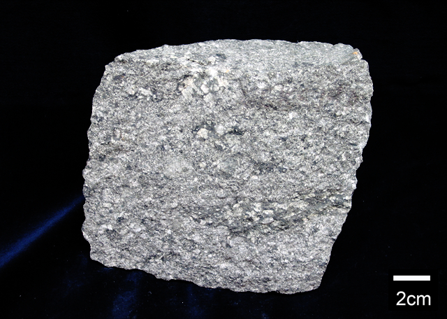 岐阜県に広く分布する濃飛流紋岩類という岩体から産する結晶の多い溶結凝灰岩の例。よく見ると右下に色の濃い部分が8 cm程度横方向に伸びています。これは、本質レンズと呼ばれ、火砕堆積物の熱と重みでつぶれた軽石と考えられています。[画像クリックで拡大]