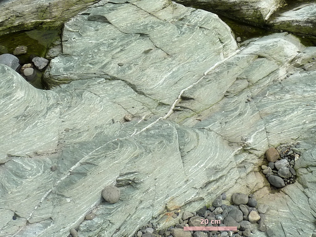 三波川変成岩の例。埼玉県長瀞町には荒川の河岸に露岩が続いており、「岩畳」として古くから有名です。2016年7月撮影。[画像クリックで拡大]