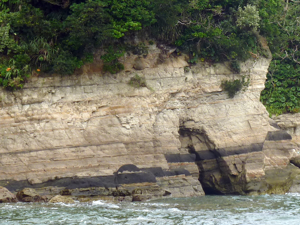 勝浦海中公園の前にある海食崖に見られる泥岩。およそ500万~450万年前に堆積したと考えられています。黒い地層は火山噴火により海中にもたらされたスコリア層で、隆起に伴ってできたと考えられているいくつもの小さな断層でずれているのが観察できます。[画像クリックで拡大]