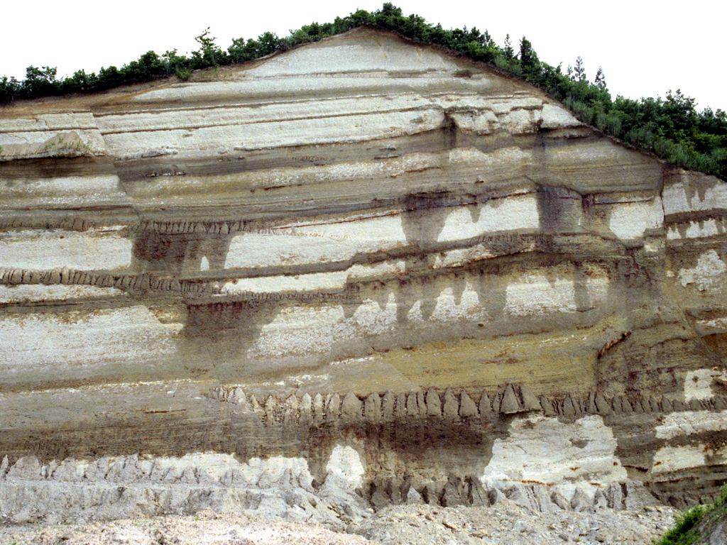 この時期 (1500~800万年前頃) の地層には、深海堆積物が多く見られます。代表的なのが珪藻質泥岩です。多島海であまり大きな陸地がない環境では、遠くまで土砂を運ぶ巨大河川も発達しません。こんなときに海に堆積するのは、主にプランクトンの死骸です。およそ1600万年以降、日本各地に珪藻質泥岩が形成されています。不純物が少なく、ほどよい固さのものは、「珪藻土」と呼ばれて採掘されることもあります。一方、熱や圧密を受けると、珪質泥岩、硬質頁岩、珪質頁岩、チャートなどと呼ばれる緻密で固い岩石になります (続成作用)。珪藻質泥岩の続成作用については、下記のリンク先を参照してください。