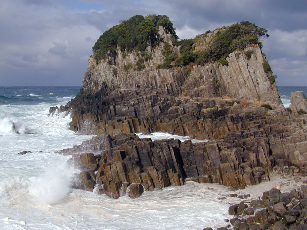 越前海岸にある鉾島に露出している流紋岩。1200万年前頃に、周囲に水のある環境下で活動した火山の岩石です。岩体の中心付近に相当するとみられ、見事な柱状節理が発達しています。[画像クリックで拡大]