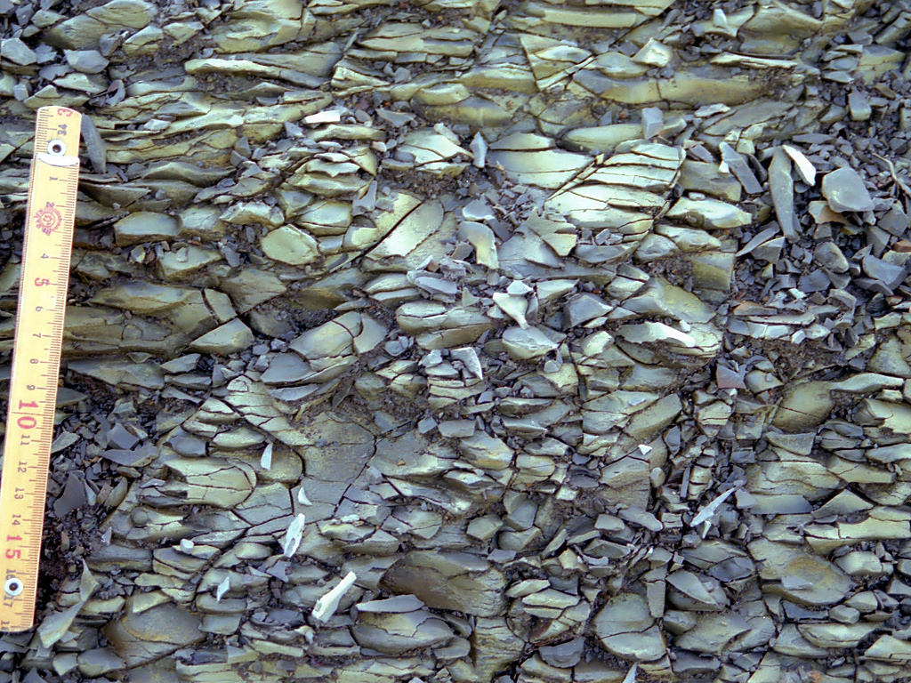 珪藻質泥岩の産状の例。深海で珪藻が静かにたまってできる経緯から、均質で粒度のそろった石になります。しかし、風化にはあまり強くなく、写真のように細かく砕ける性質があります (スレーキング)。[画像クリックで拡大]