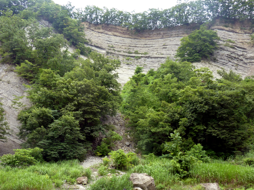 埼玉県の秩父盆地にある「ようばけ」という有名な崖にも、日本海ができた頃 (約1550万年前) の海成層が厚く堆積しています。2016年7月撮影。[画像クリックで拡大]