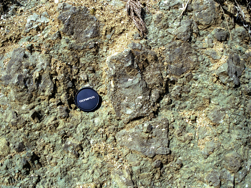 グリーンタフと呼ばれることのある変質した火山岩類の例。この写真は、海底に噴出した玄武岩溶岩です。[画像クリックで拡大]