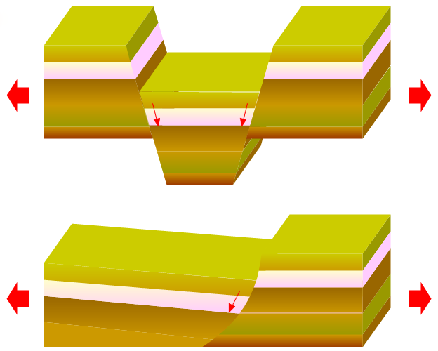 グラーベン・ハーフグラーベンのイメージ図。両側が落ち込んだのがグラーベン、片側だけ落ち込んでいるのがハーフグラーベンで、それぞれ地溝・半地溝とも呼ばれます。いずれも地殻が引き延ばされるときに形成される地形です。[画像クリックで拡大]