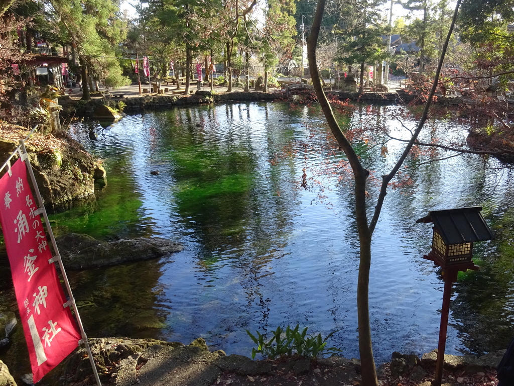 佐野市の出流原弁天池は、石灰岩の割れ目からの湧水を水源としており、とても澄んだ水を湛えています。2019年1月撮影。[画像クリックで拡大]