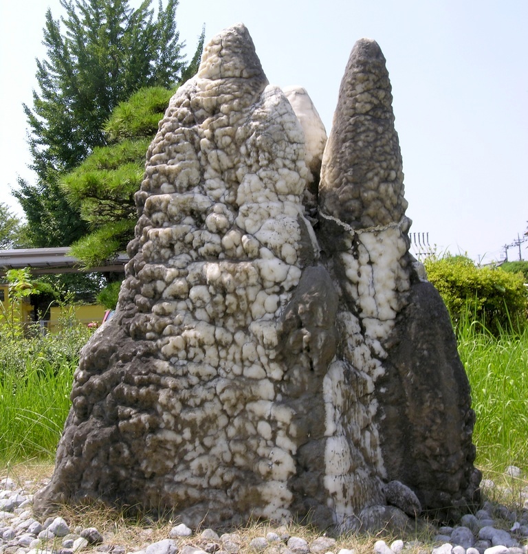 鍾乳洞に産する石筍の例。佐野市の葛生化石館の庭に展示されている高さ1.5 mの石筍。2016年8月撮影。[画像クリックで拡大]