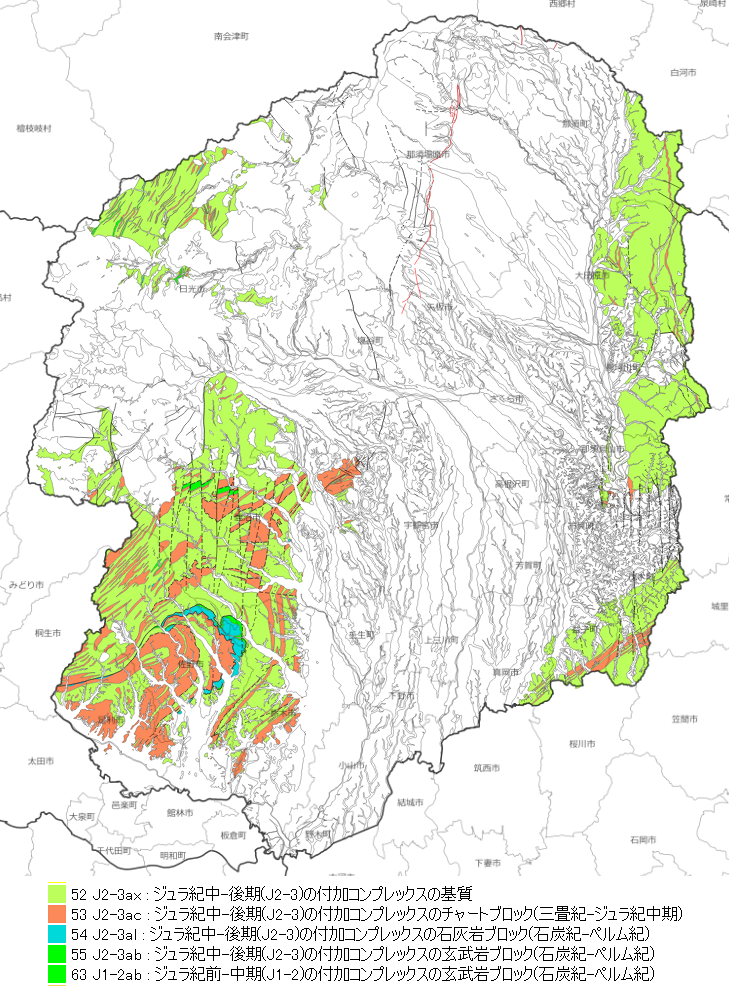 栃木県内のジュラ紀の付加体の分布。チャート、石灰岩が足尾山地に多く、八溝山地に少ないことが分かります。[画像クリックで拡大]