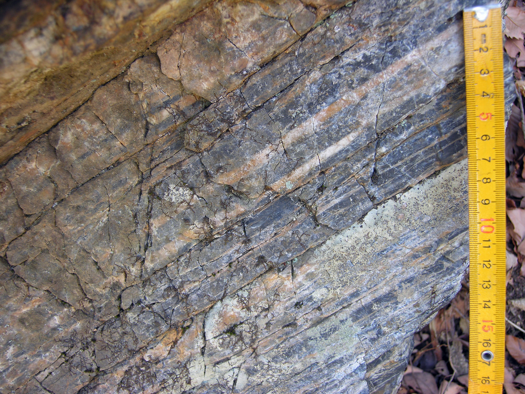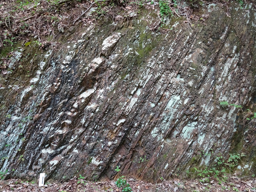 成層した頁岩 (砂岩を挟有)。益子町高館山の林道にて2017年9月撮影。[画像クリックで拡大]