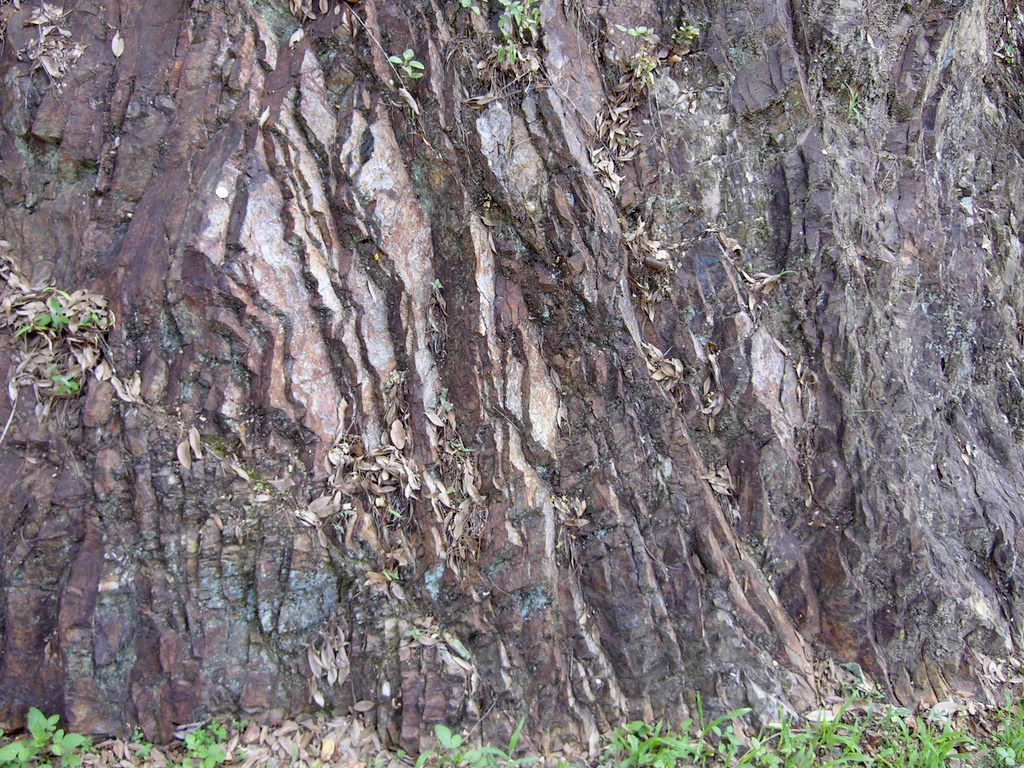チャートの産状の例。佐野市唐沢山城址の駐車場脇に露出する層状チャート。2016年8月撮影。[画像クリックで拡大]