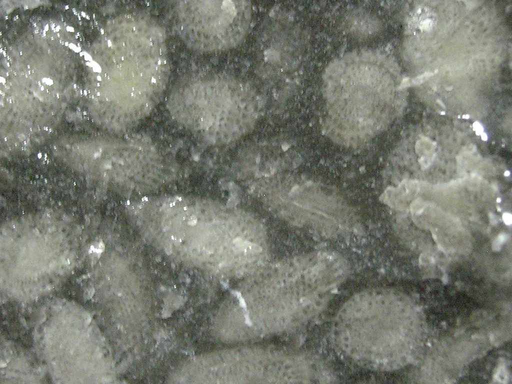 石灰岩に含まれるフズリナ (紡錘虫) の化石。紡錘と言っても分からないかも知れませんが、要はラグビーボールのような形です。佐野市の葛生化石館でもらったお土産の石を水で濡らして撮影。フズリナの大きさは約5 mm。[画像クリックで拡大]