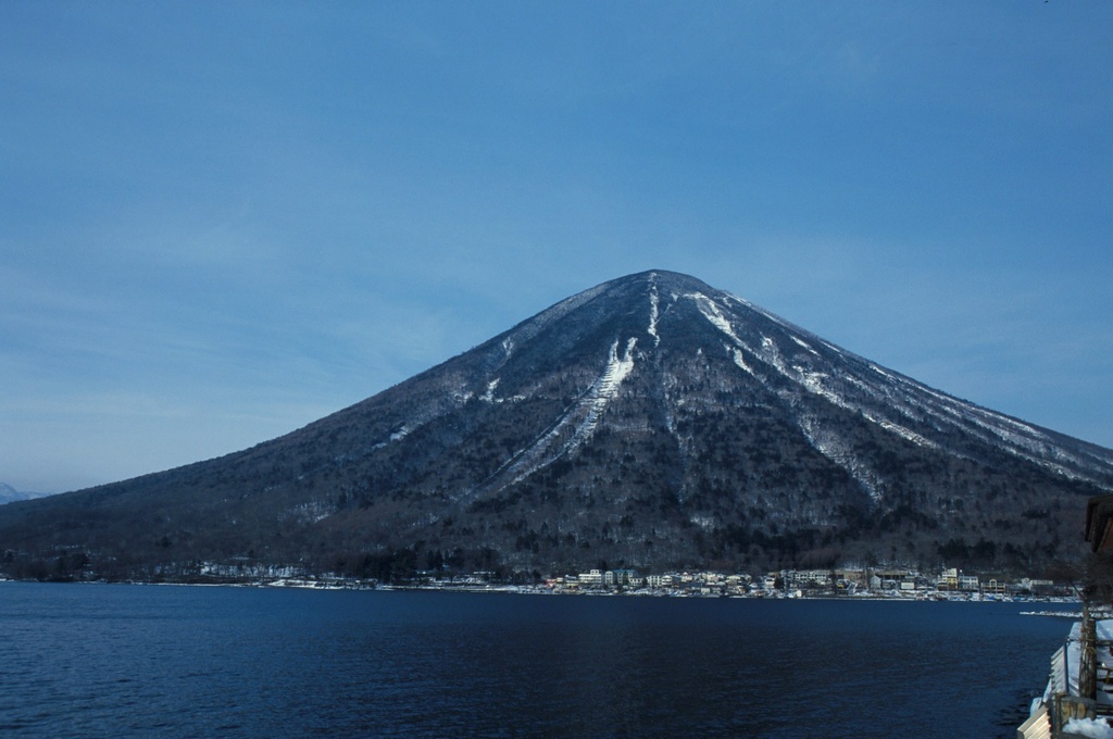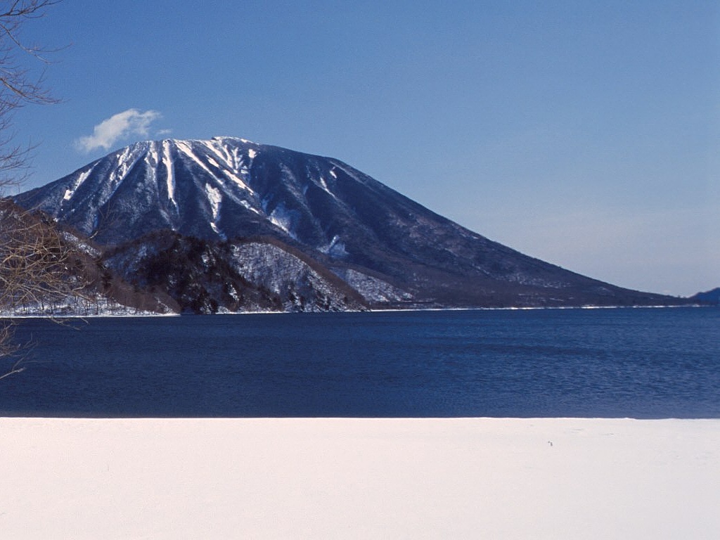 男体山の西側斜面。西側からの眺めでは、男体山は山頂部が広く見えます。日光市千手ヶ浜にて。2000年2月撮影。[画像クリックで拡大]