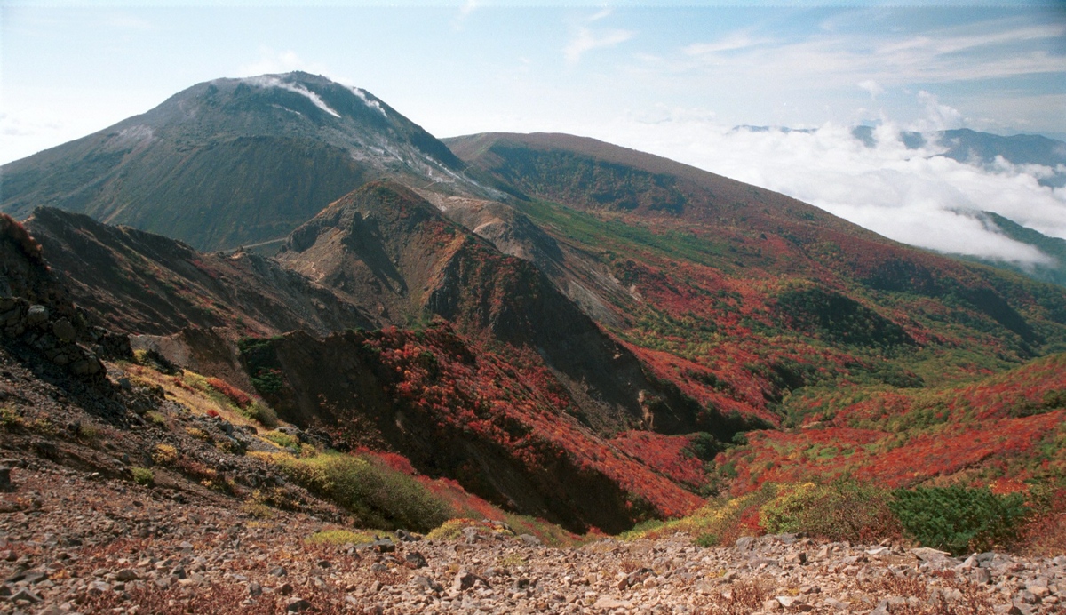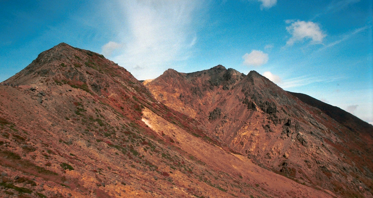 峰の茶屋付近から望む朝日岳 (右奥のピーク)。左手前側のピークは剣が峰。いずれも朝日岳火山の噴出物からできています。山体の浸食が進み、険しい地形を成しています。1996年10月撮影。[画像クリックで拡大]