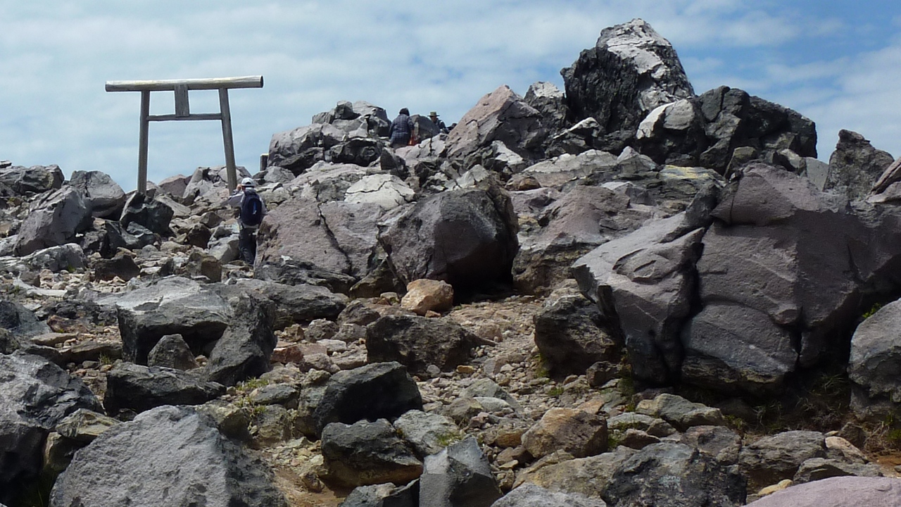 茶臼岳山頂には火口があり、登山道が一周しています。噴火からは600年以上も経っており、この間厳しい風雨にさらされているのですが、山頂溶岩の大型の岩塊にはいまだに鋭いエッジや割れ目がはっきり残っています。