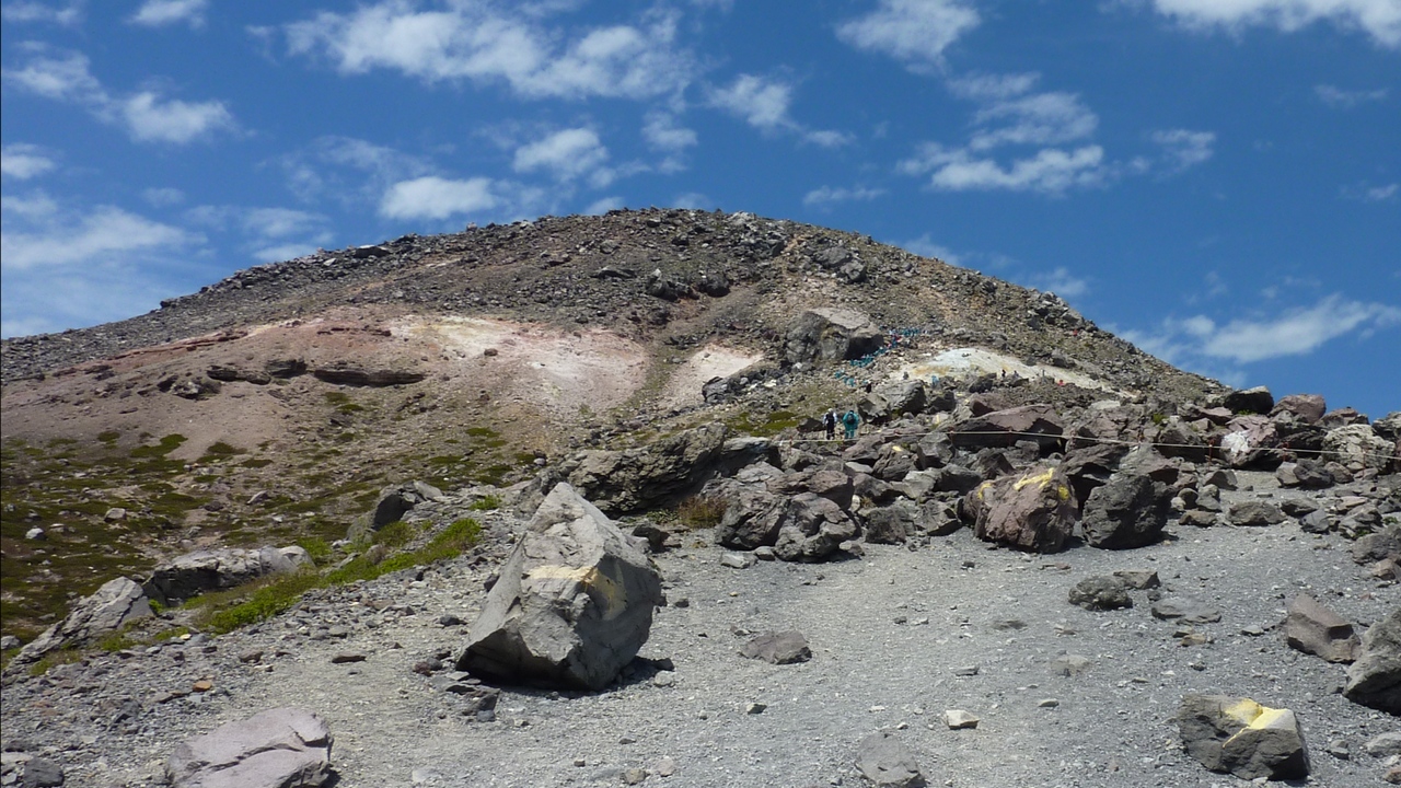 このように、那須火山群は活動中心が異なる複数の火山が、比較的狭い範囲に集合した形になっています。したがって、古い火山では浸食が進み火山体の内部構造が露出している一方、新しい火山では噴出物が新鮮な状態で残っていたり、熱いマグマの存在による噴気活動が見られたりします。