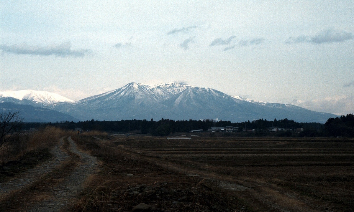 那須塩原市の宇都野橋 (箒川) 付近から望む南月山 (中央)。ちょうど背後に茶臼岳とその噴気がが重なっており、ピークの輪郭が不明瞭になっています。左側のピークは白笹山、中央手前側に位置するやや低いピークは黒尾谷岳。1998年3月撮影。[画像クリックで拡大]