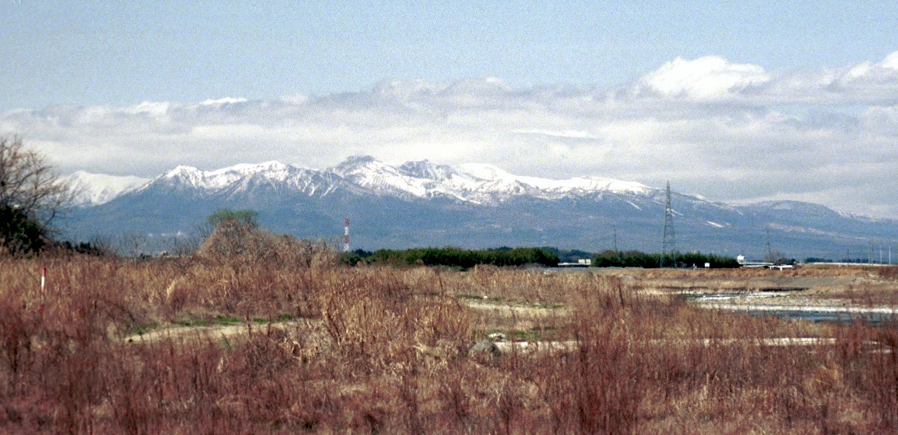 那珂川町の那珂川河床から望む那須火山群。1996年4月撮影。画像をクリックすると説明の有無が変更可能。[画像クリックで拡大]