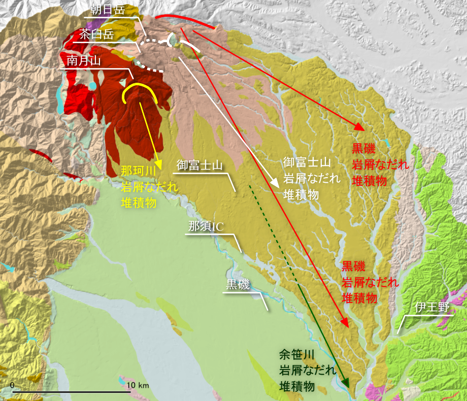 那須火山群の特徴として、南東麓に広がる広大な火山性扇状地の存在が挙げられます。地質図を見ると、扇状地の多くは岩屑なだれ堆積物が占めており、しかも年代の異なるいくつもの堆積物が認められます。つまり、那須火山群は山体を成長させる一方、たびたび大規模な山体崩壊を起こし、裾野に大量の岩屑を供給してきたわけです。