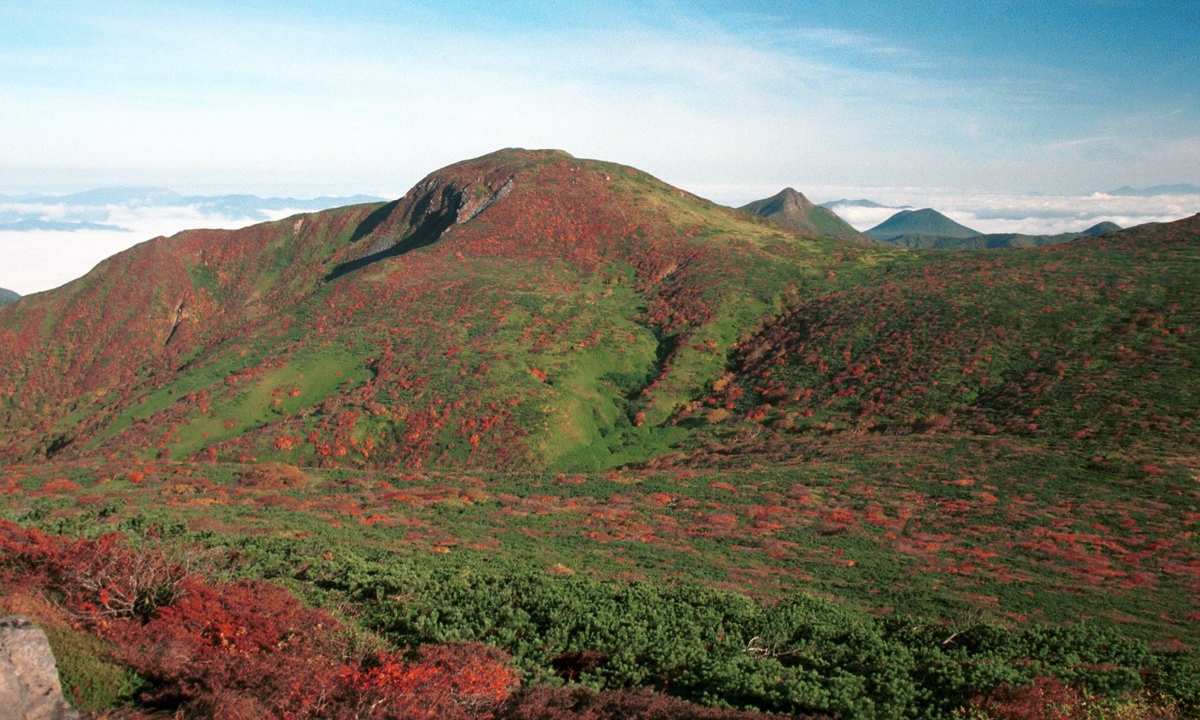 熊見曽根付近から南方に向かって望む剣が峰 (中央手前)、茶臼岳 (中央左奥)、日の出平 (中央奥)。年代の古い順に、剣が峰は朝日岳火山噴出物、日の出平は南月山火山の噴出物、茶臼岳は茶臼岳火山噴出物からできており、火山地形の保存状態がそれぞれ異なるのが分かります。また、玄武岩溶岩の日の出平はなだらかなスロープであるのに対し、安山岩溶岩の茶臼岳はより傾斜のきついドーム状の山体を成しています。1996年10月撮影。[画像クリックで拡大]