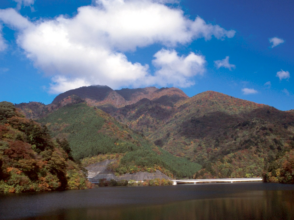 日光市今市ダムから臨む月山 (山頂は右より一番奥)。このドーム状の山体も新第三紀終わり頃に活動した火山の噴出物とみられています。2000年11月撮影。[画像クリックで拡大]