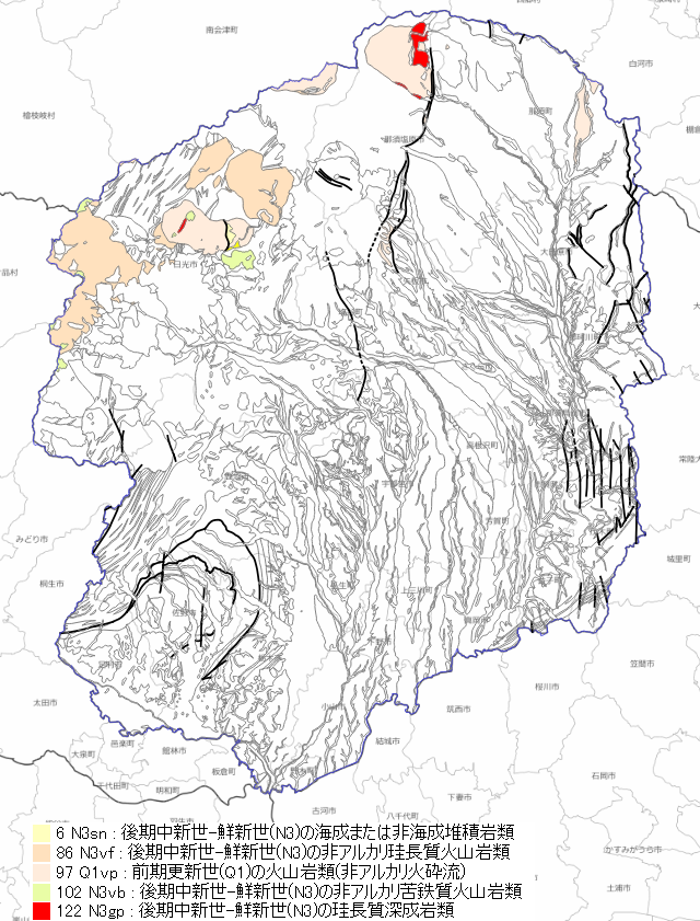 栃木県内の新第三紀後期の地質の分布。この時代の地層は、県北部の山地に見られる火山岩類です。[画像クリックで拡大]