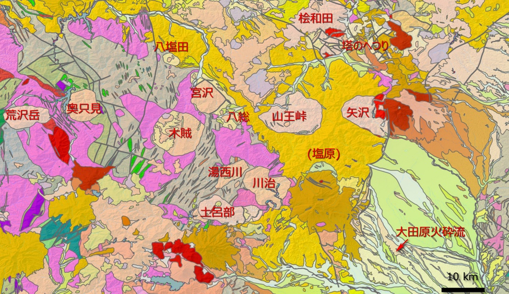 栃木県北部から福島県南部にかけての地質図を見ると、薄いピンクの地質が楕円や円形に分布しているのがわかります。これはみな、巨大噴火によって地表が陥没したカルデラと、そこを埋めた火山岩です。もっとも、カルデラの地形を残しているのはごく一部 (塩原カルデラの北半分) のみで、他の場合は地形としては判別がつきません。このような浸食されてしまったカルデラを「コールドロン」と呼びます。カルデラおよびコールドロンについては、地球科学の基礎知識にある「カルデラ噴火」のページをご覧下さい。