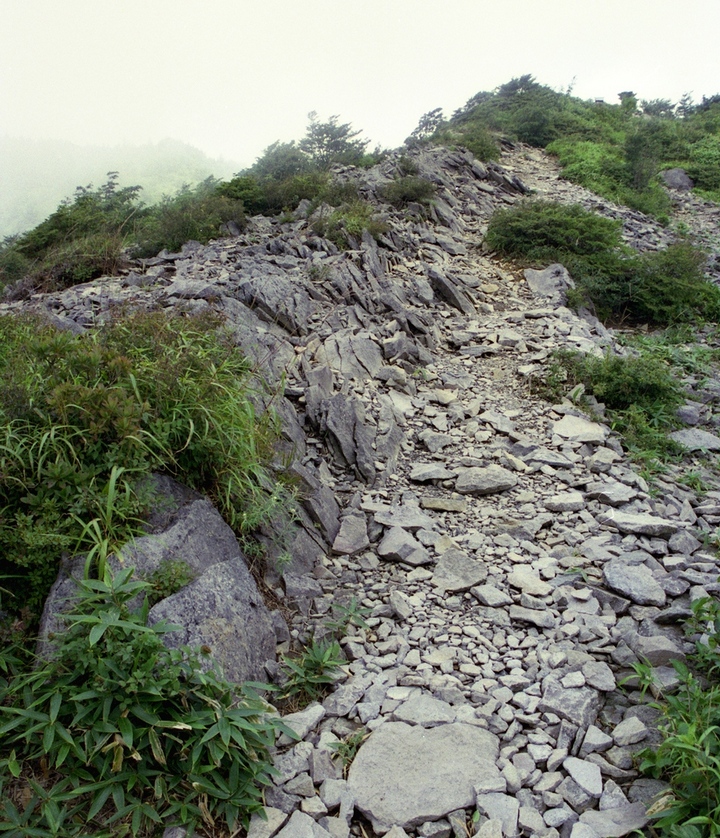 大間々溶岩の板状節理。ちょうど尾根に沿った方向に伸びています。八方ヶ原大間々台から剣ヶ峰に至る登山道にて1990年8月撮影。[画像クリックで拡大]