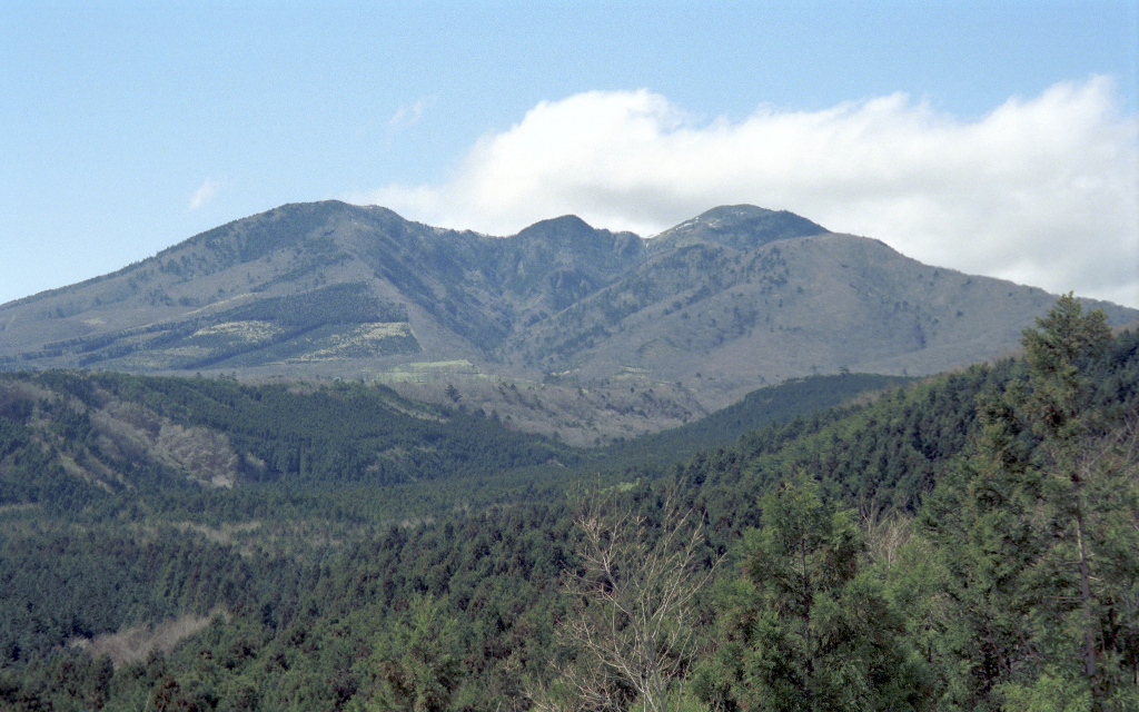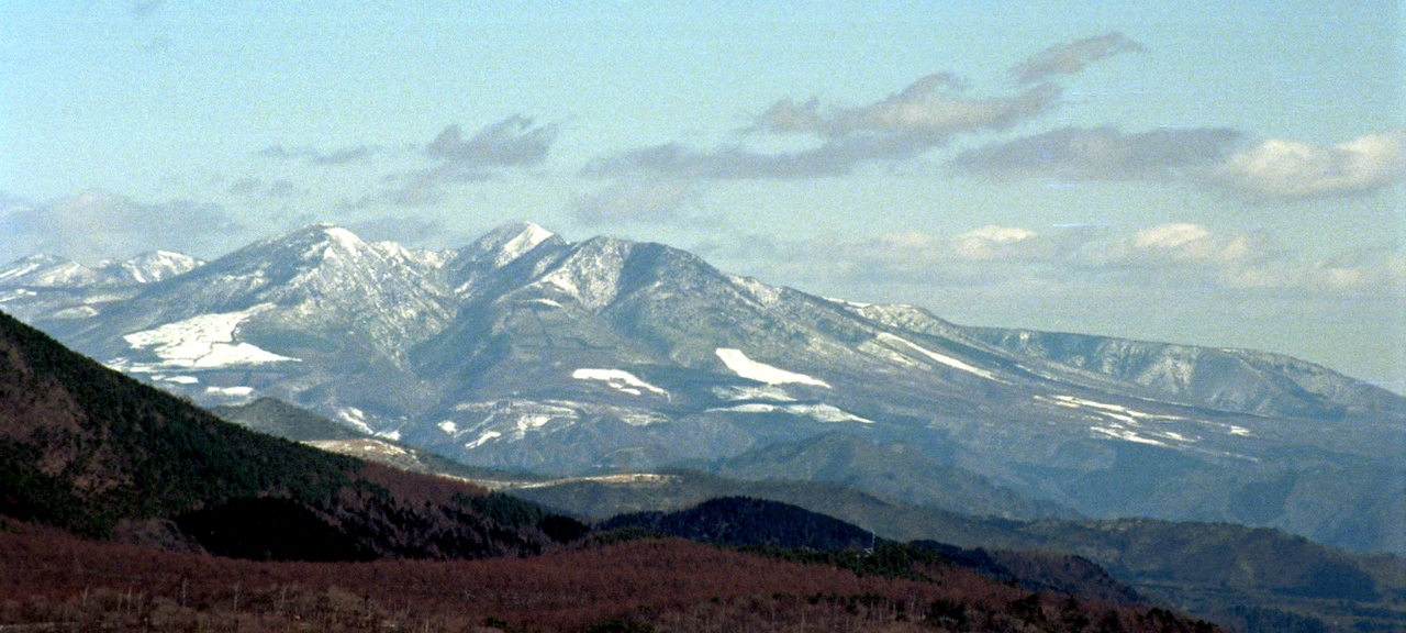 第二いろは坂黒髪平展望台から望む高原火山群 (南西方からの遠望)。3つのピークと中央に刻まれた深い谷 (野沢) が目立ちます。1991年2月撮影。画像をクリックすると説明の有無が変更可能。[画像クリックで拡大]