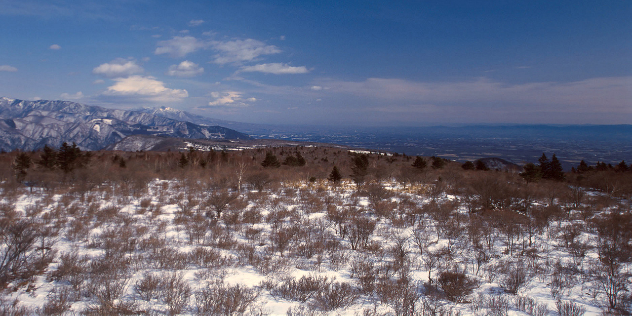 八方ヶ原大間々台の展望台から北東方の眺め。大間々溶岩と呼ばれる溶岩流のつくる平坦面が山の上に広がっています。左寄り遠方に見えるのは那須火山群。2000年2月撮影。[画像クリックで拡大]
