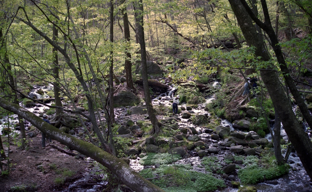 塩谷町の尚仁沢湧水。尚仁沢の右岸側に当たる斜面から豊富な湧き水が流れ出しています。尚仁沢湧水は環境省の選定した名水百選に選ばれています。1993年5月撮影。[画像クリックで拡大]