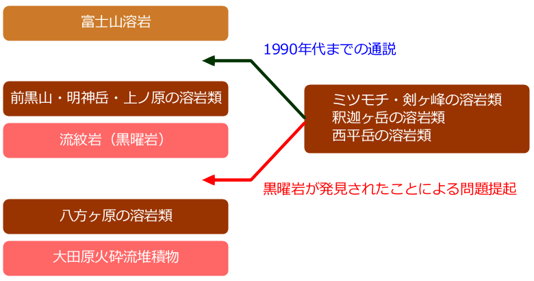 高原火山群の火山層序の現状を示した図。高原火山群のうち、北側に位置する前黒山・明神岳・上ノ原などに分布する溶岩類と、南側に位置するミツモチ・剣ヶ峰・釈迦ヶ岳・西平岳などに分布する溶岩類のどちらが先に活動していたか、今後解決されるべき課題です。[画像クリックで拡大]