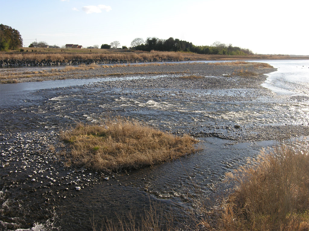 上三川町東蓼沼付近における鬼怒川の様子。このように、栃木県の河原には礫がごろごろしています。[画像クリックで拡大]