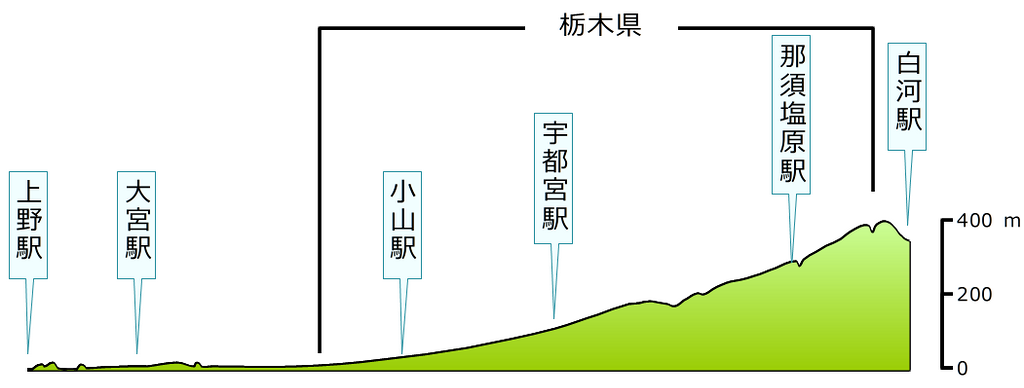 東北新幹線の路線の標高の断面。[画像クリックで拡大]