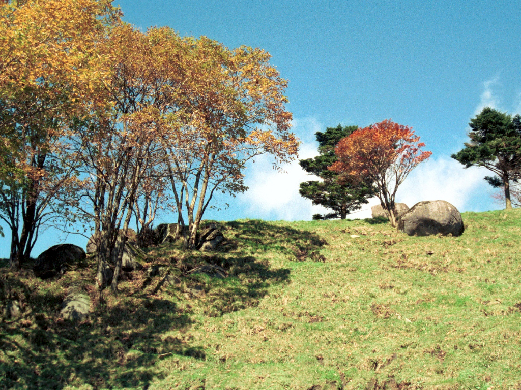 横根山に広がる前日光牧場の風景。花崗閃緑岩の風化に起因するなだらかな地形と、残された風化核のコアストーンが特徴的です。1990年10月撮影。[画像クリックで拡大]