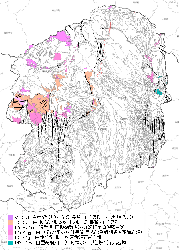 栃木県内の白亜紀の火成岩の分布。主に日光地域に分布していることが分かります。[画像クリックで拡大]