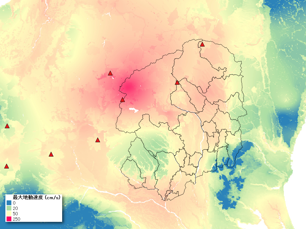 2013年2月25日に奥日光地域で発生したマグニチュード6.2、深さ10 kmの地震による地震動 (最大地動速度を計算により表した図)。固い地盤が卓越するため普段はあまり揺れない山岳地域が、強い揺れに見舞われたことが分かります。真冬の地震でしたので、斜面崩壊のほかに雪崩による交通被害もありました。[画像クリックで拡大]