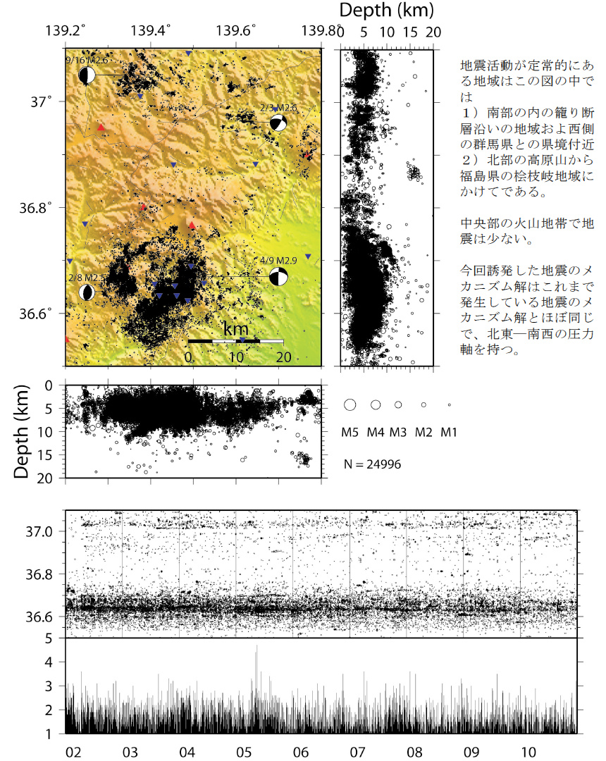 日光地域で定常的に発生している地震の例。地理的には皇海山付近と内ノ籠断層周辺、深さでは5 km程度に集中しています。また、火山 (赤三角印) である男体山 (中央) や日光白根山 (中央左)、燧ヶ岳 (左上) の付近では地震がたいへん少ないことがわかります。一番下の棒グラフは、2002年から2010年の地震の発生頻度を表しています。[画像クリックで拡大]
