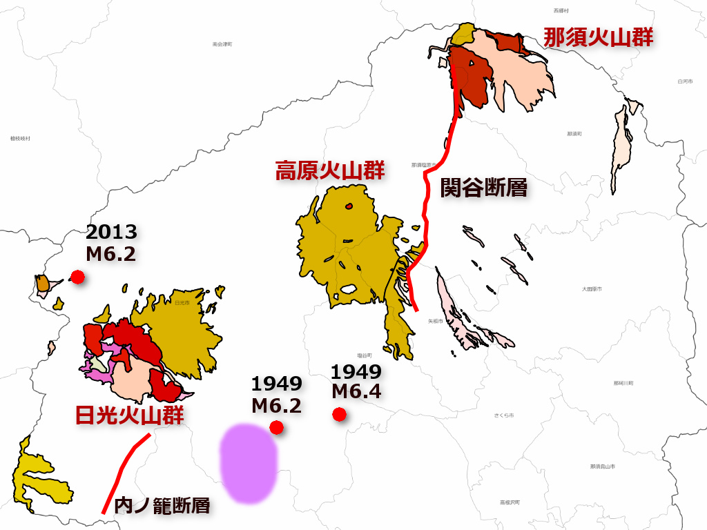 より広域に見てみると、関谷断層は那須火山と高原火山の間にあるようにも解釈できます。また、1949年の今市地震は被害状況や余震域から類推すると日光火山からやや離れた場所を震源域として起きたように見えます。すなわち、火山の近くでは比較的小さな地震が多いのに対し、少し離れた地域ではそれより大きな地震が発生する可能性があります。