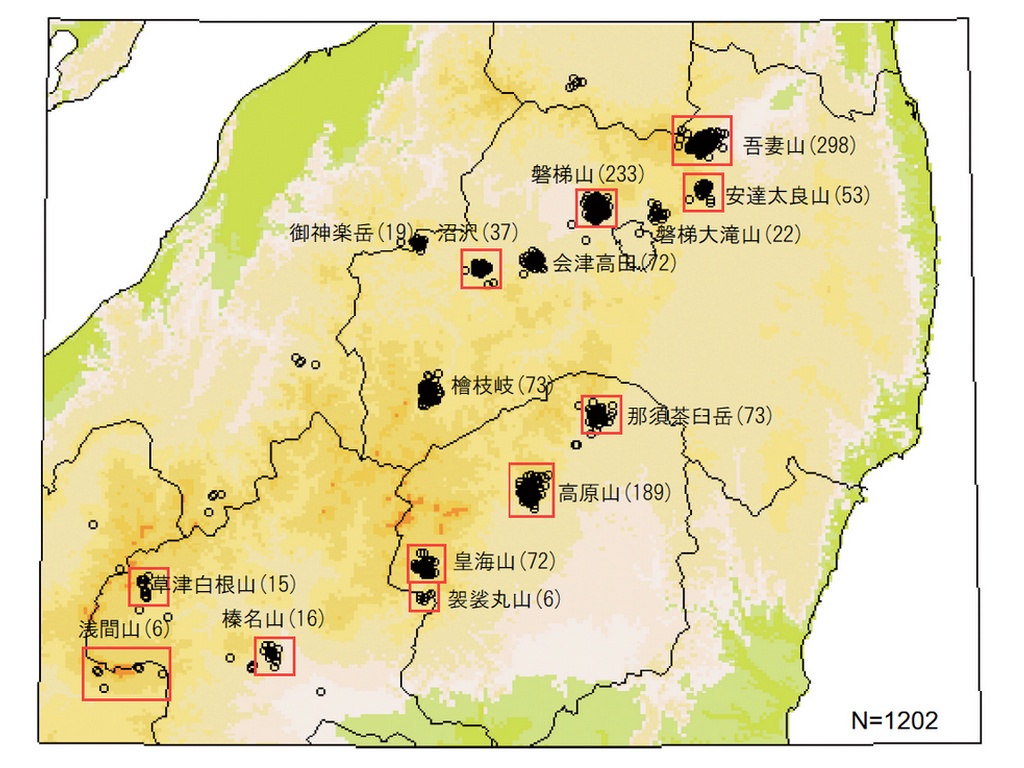 )。日光火山群では火山の直下からは南側にずれた位置に分布します。