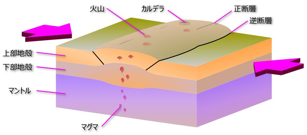 同様の可能性は他の地域でも既に報告されています。現在の日本列島は圧縮応力場ですが、相対的に「軟らかい」火山地域が隆起して非火山地域との間に逆断層が形成されると解釈されています (長谷川ほか, 2004)。また、隆起する地殻の表面は局所的に引張応力場となるため、正断層やカルデラができやすくなります (お餅やパンの表面が膨らんで亀裂ができたり、ガスが抜けてくぼむようなイメージですね)。