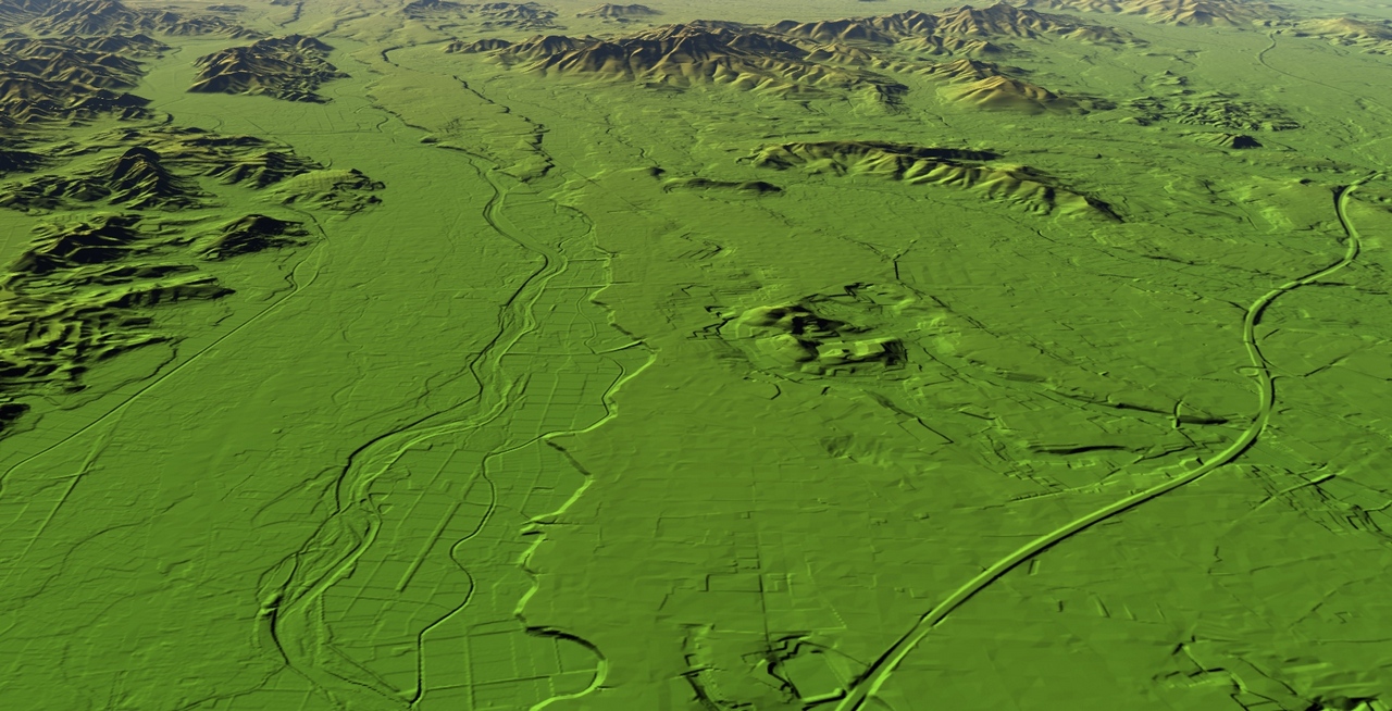 鹿沼市付近の立体地形図 (黒川上空の南方から鹿沼市街方面を望んだところ)。中央左を流れる黒川の右 (東側) に段丘崖があり、そこから東に鹿沼段丘が広がっています。山地や丘陵と比べると、段丘の地形面がきわめて平坦であるのがわかります。[画像クリックで拡大]