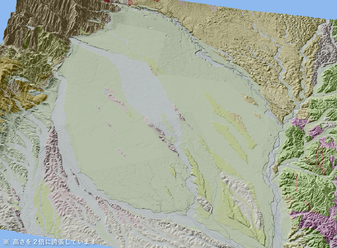 今市扇状地とその周辺の3D地質図。南東側上空からの北西方向を望む鳥瞰イメージ図。画像をクリックすると説明の有無が変更可能。[画像クリックで拡大]