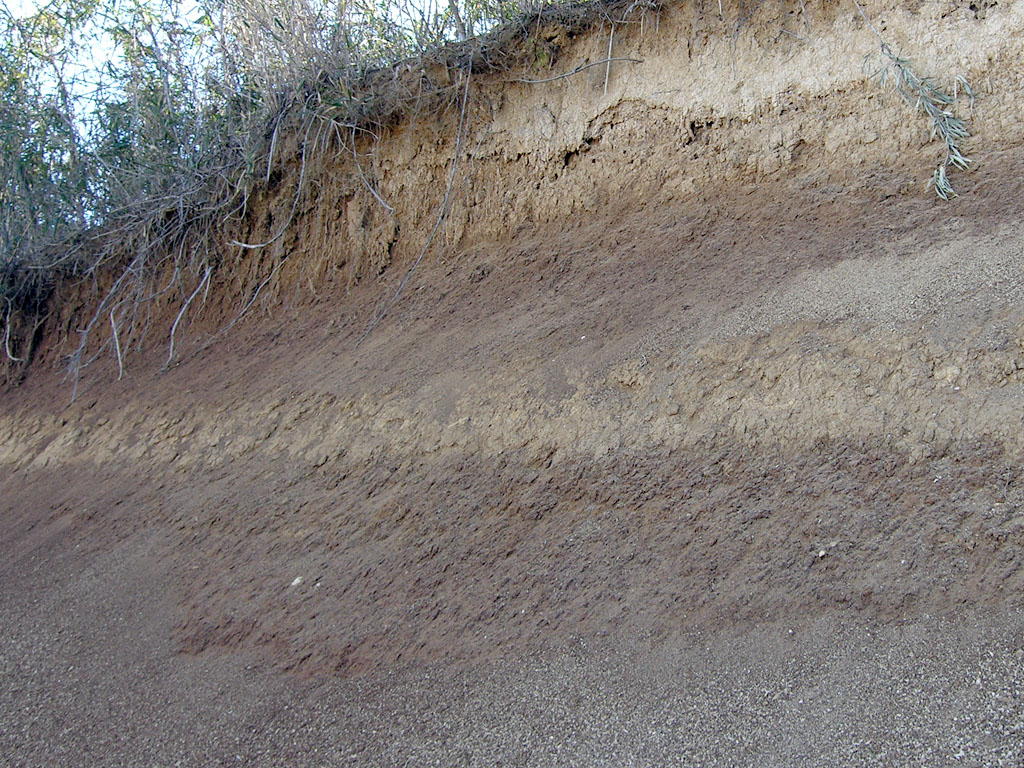 ローム層は、下の写真のように赤茶けた色の土で、火山灰や風成塵 (風で飛ばされた微細な粒子) からなります。大陸由来の黄砂や、火山の噴煙に含まれる火山ガラスはロームの主要な材料です。