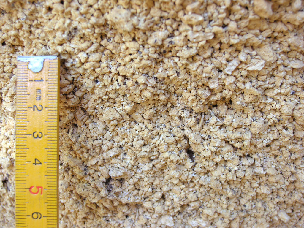 上の写真は真岡市に見られる赤城鹿沼テフラ (Ag-KP) です。その名の通り、赤城山の噴火で飛ばされてきた軽石が降り積もったものです。写真でわかるように、軽石には極端に大きなものも、逆に微細なものもなく、ある程度サイズのそろった粒子ばかりからできています。これは、噴火で飛ばされた粒子が地上に落ちてくるときに、大きく重いものは火山の近くに降り積もる一方、小さくて軽いものはより遠くへ運ばれるため、粒子サイズが選り分けられることによる結果で、降り積もってできる地層 (降下堆積物) の特徴です。