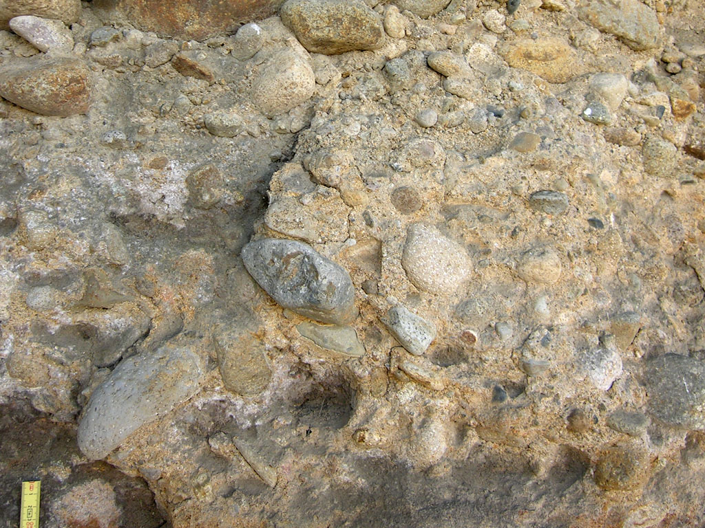 段丘礫層は、下の写真のように大小さまざまな礫が、砂の基質で支えられています。