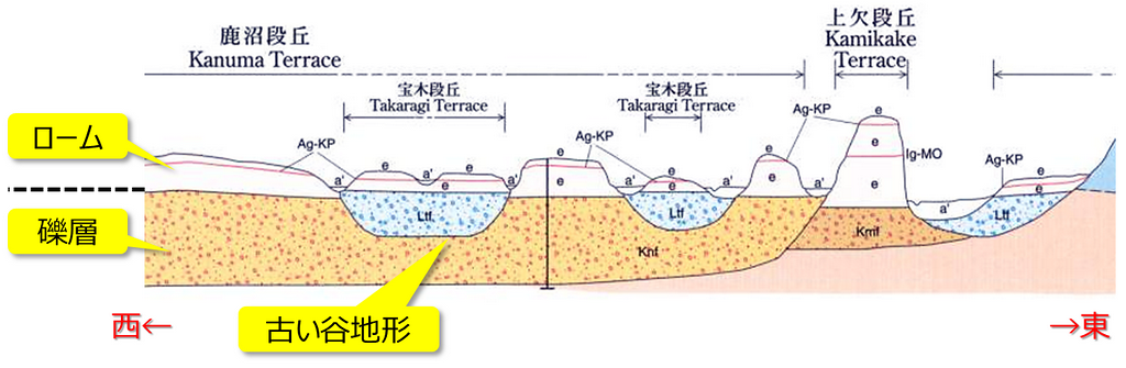 宇都宮付近の段丘堆積物の東西断面図。侵食の時期に一度削られた凹地を、より厚い礫層が埋めているのが分かります。ローム層の中の赤い線は広域テフラ。[画像クリックで拡大]